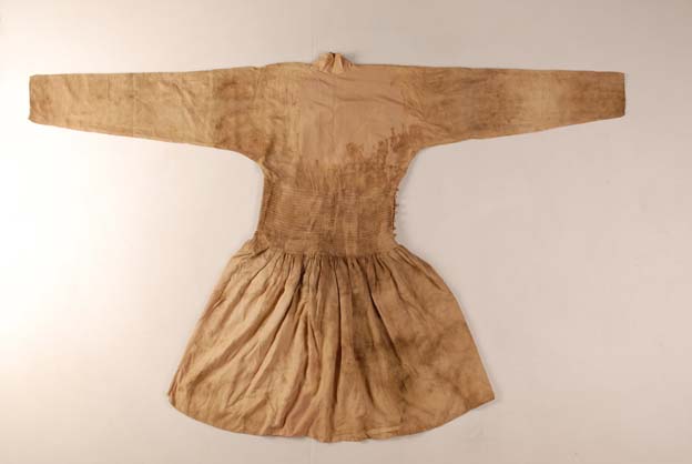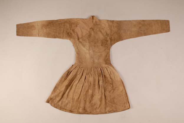 該衣右衽交領(lǐng),窄袖,平紋絹?zhàn)鲆r,后襟左邊開衩19cm。18根寬為0. 7cm的絲帶平行地繞腰一圈,形成一條寬18.5 cm的腰線區(qū),這種腰線款式在韓國同時(shí)期的遺存中也有發(fā)現(xiàn)。雖然面料和袍服腰以上部分相同,裙擺部分還是由兩塊獨(dú)立的面料裁成,下擺大而褶皺細(xì)密如裙,共有153個(gè)褶。衣身面料為2/1地上起1/2花的花鳥紋綾,紋樣循環(huán)經(jīng)緯向均為7 cm。