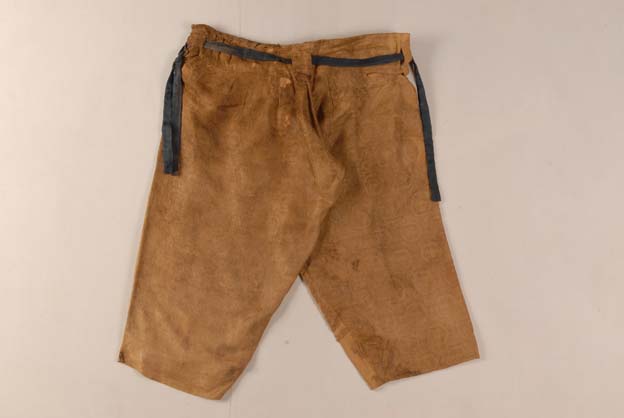 該褲和一對靴套為一套保存完整的蒙元服飾下裝,從英國古董商處收購,其中綾褲長82cm,,寬68cm;靴套長33cm,高30cm,寬18.6 cm。綾褲腰上有四個藍色絹制成的襻,可能是國內目前所知最早的褲襻,可推測為西方縫制款式。該褲所用面料是花綾,紋樣是六出地上六瓣團窠格力芬。紋樣循環(huán)經(jīng)向13cm,緯向7.2-7.5cm