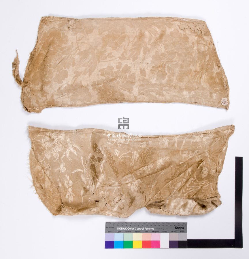 形狀內(nèi)容描述 此件襪套共有一對(duì),呈直筒形,其基礎(chǔ)組織為五枚經(jīng)緞地上起五枚緯緞花,其主題紋樣為折枝牡丹花及蝴蝶圖案。