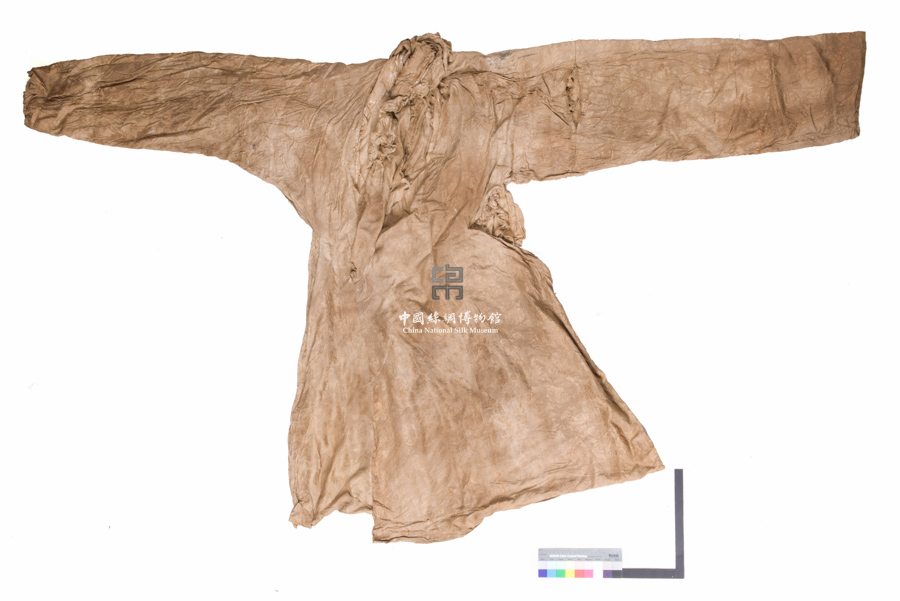 形狀內(nèi)容描述 此件衣服較為破損,右衽、交領(lǐng)、長袖,中襯絲綿,衣服采用暗花綾織物制成,其地組織為2/1左斜紋組織,花組織為1/5左斜紋組織,主題紋樣為折枝花卉。