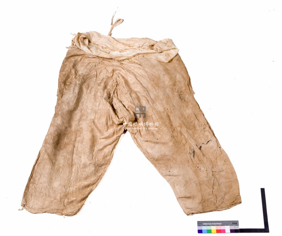 形狀內(nèi)容描述 此綿褲,褲腿肥闊,面料為黃色纏枝花卉暗花緞。