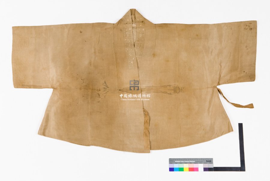 形狀內(nèi)容描述 衣服對襟、直領(lǐng),領(lǐng)緣貼有刺繡花卉紋花邊,門襟處有兩根系帶,兩邊腋下開衩,用1/1平紋絹制成。