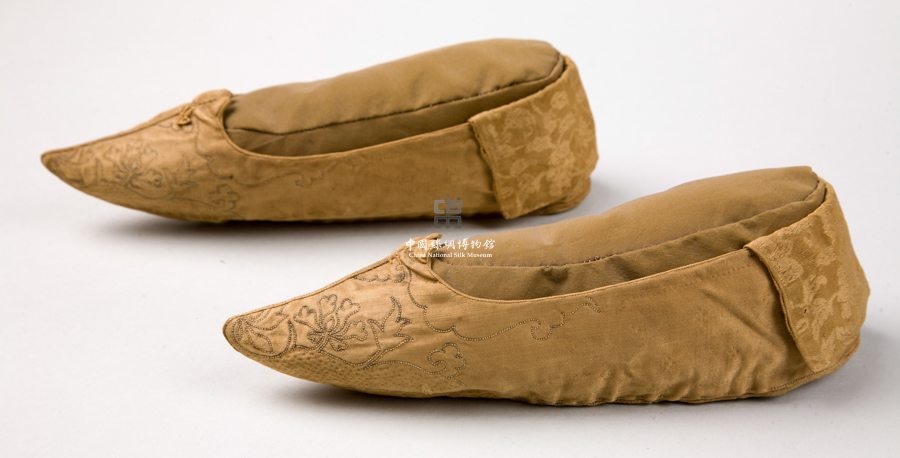形狀內(nèi)容描述 該件繡鞋共兩只,以五枚素緞做地,鞋背上用釘金線繡出牡丹花卉紋樣。
