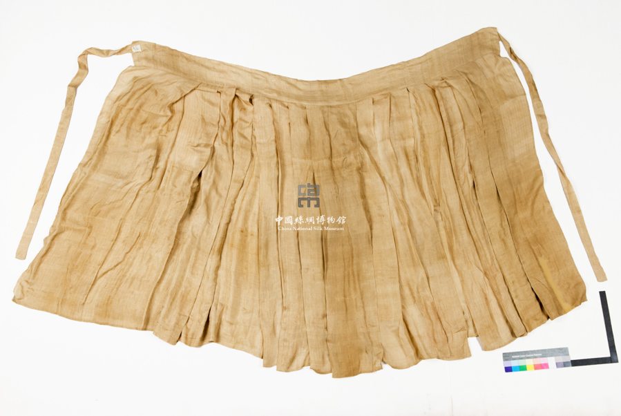 形狀內(nèi)容描述 裙子為百褶,前片和后片的中間開(kāi)衩并留有大于其他褶一倍的一大褶,形似清代的馬面裙,裙的面料為1/1平紋的絹織物。
