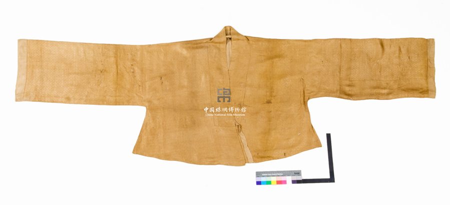 形狀內(nèi)容描述 衣服對(duì)襟、直領(lǐng),袖緣用絹貼邊,以用1/1平紋地上起卍字田格紋花的織物制成。