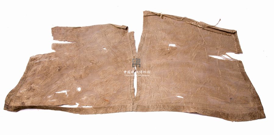 形狀內(nèi)容描述 該殘片呈淺褐色,清晰可見云紋。面料質(zhì)地為紗,輕薄。推斷原件為內(nèi)衣。