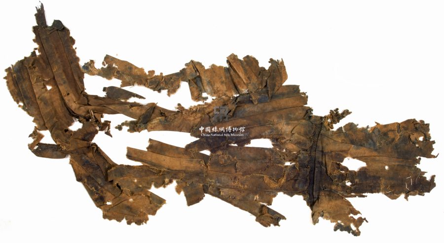 形狀內(nèi)容描述 該織物已經(jīng)相當(dāng)殘破,其面料采用四合云紋綺。推斷其原件為壽衣一部分。