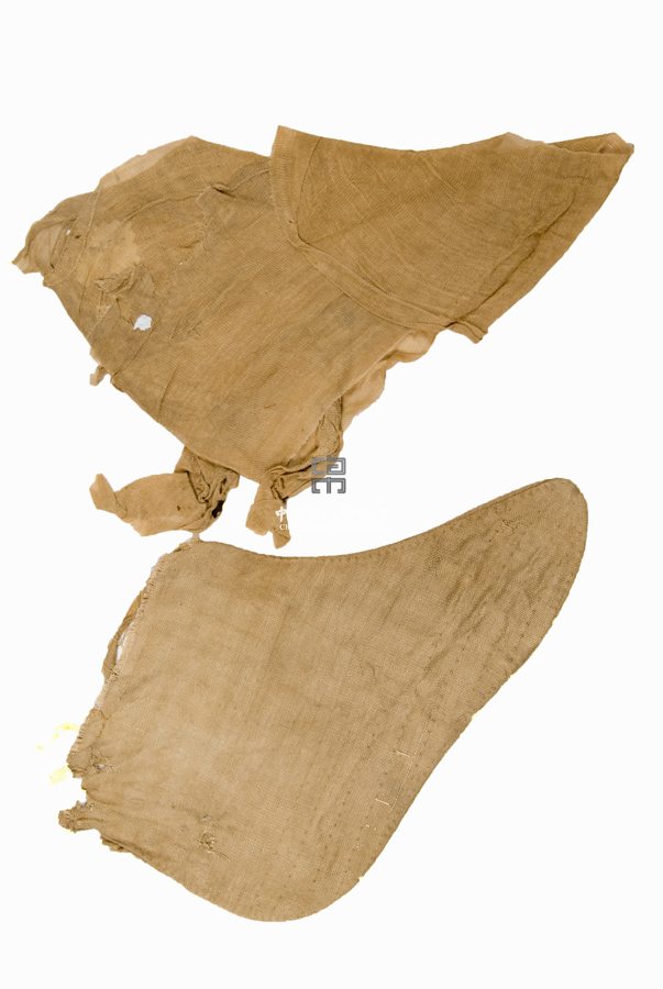 形狀內(nèi)容描述 此套絹襪與裹腳紗出土于明墓,為明永樂年間的婦女所服用。裹紗為長條形,纏于足上,為以絞紗組織織成的素紗織物。襪則以平紋素絹制成。