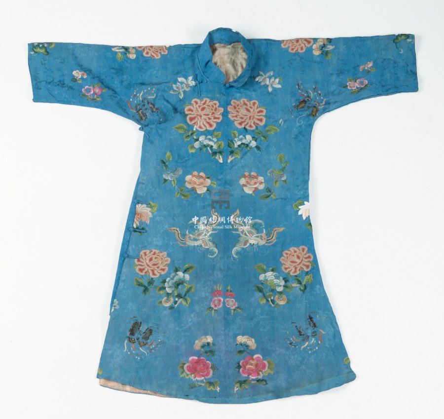 形狀內(nèi)容描述 該件褂子為兒童服用,右衽,兩邊開衩。以藍色縐綢為衣身面料,黃色絹做襯里。衣身彩繡花蝶紋樣。針法以套針為主。
