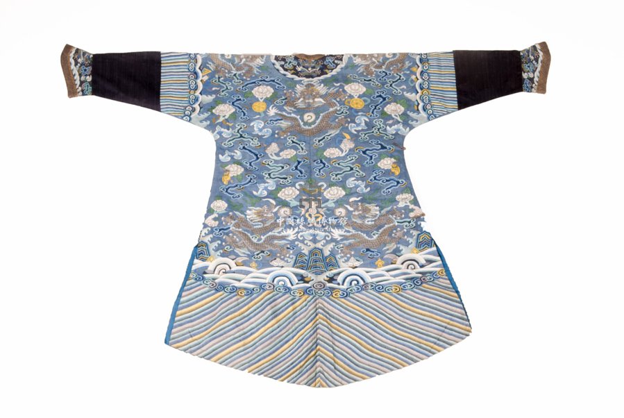 形狀內(nèi)容描述 該夾袍右衽、馬蹄袖,藍(lán)地緙絲。主題紋樣為云龍戲珠,以及象征吉祥的云蝠牡丹八寶紋。