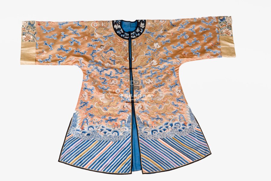 形狀內(nèi)容描述 此褂為對襟、圓領(lǐng)、一字扣。緞地上采用平繡技法,以紅色絲線繡出蝙蝠,以藍色絲線繡出云紋,云紋以月白絲線勾邊。褂前及后背、兩袖各用盤金繡繡出九龍。袖頭為白色緞地彩繡花卉。
