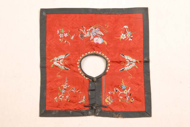 口圍是民間常見的繡品,又可稱為圍嘴,使用對象是孩子,因?yàn)樾『⒆訒r(shí)常流涎水,用這種布縫制的圓環(huán)形墊子,套在孩子脖子上,涎水打濕一片,就轉(zhuǎn)動(dòng)一下,使下巴接觸部位總是干的。圍嘴有做成老虎形的,青蛙形、蓮花形的等等,既實(shí)用,又美觀。該口圍用紅色料作地,其上繡蝶戀花紋樣。上釘有黑色一字盤扣兩枚。周圍鑲黑邊。