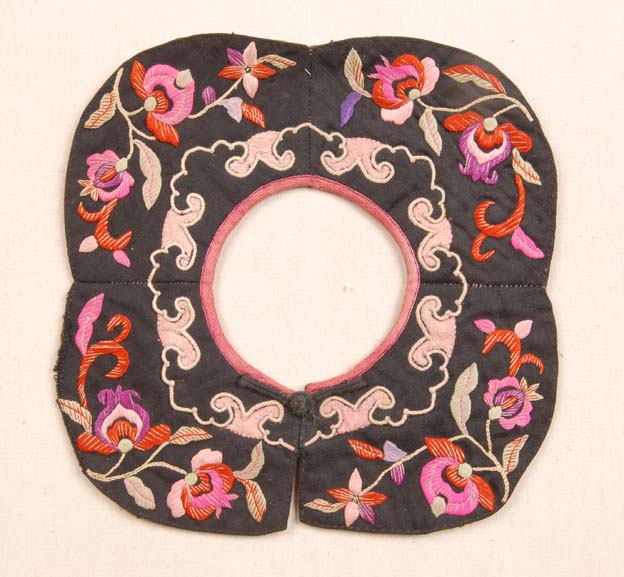 口圍是民間常見的繡品,又可稱為圍嘴,使用對象是孩子,因為小孩子時常流涎水,用這種布縫制的圓環(huán)形墊子,套在孩子脖子上,涎水打濕一片,就轉(zhuǎn)動一下,使下巴接觸部位總是干的。圍嘴有做成老虎形的,青蛙形、蓮花形的等等,既實用,又美觀。該口圍用黑色料作地,其上彩繡花卉紋樣。上釘有黑色一字盤扣一枚。