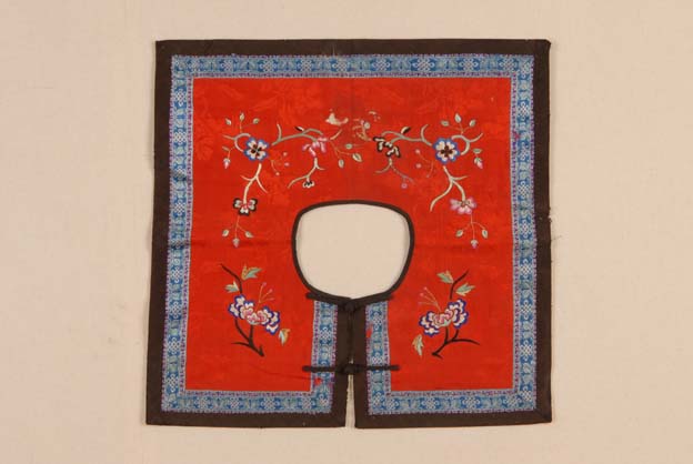 口圍是民間常見的繡品,又可稱為圍嘴,使用對(duì)象是孩子,因?yàn)樾『⒆訒r(shí)常流涎水,用這種布縫制的圓環(huán)形墊子,套在孩子脖子上,涎水打濕一片,就轉(zhuǎn)動(dòng)一下,使下巴接觸部位總是干的。圍嘴有做成老虎形的,青蛙形、蓮花形的等等,既實(shí)用,又美觀。該口圍用紅色料作地,其上彩繡花卉紋樣。上釘有黑色一字盤扣兩枚。周圍鑲黑邊。
