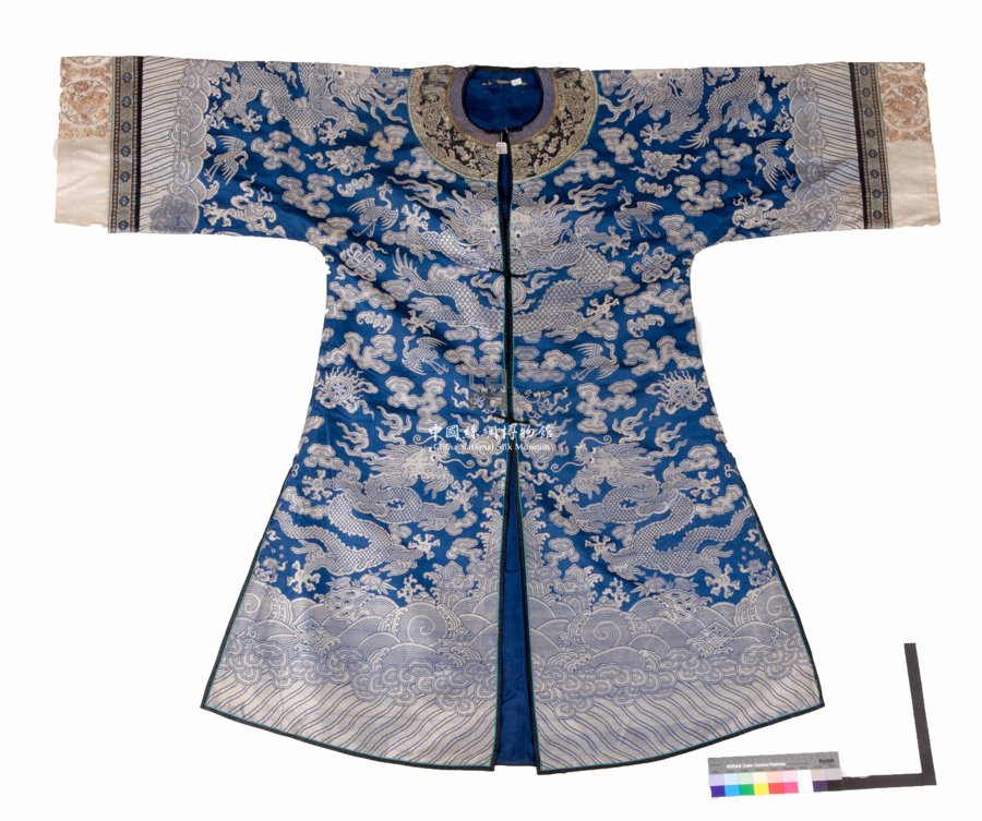 形狀內(nèi)容描述 此件夾褂對(duì)襟、無(wú)領(lǐng),主體面料為兩色綢,其基本組織為三枚右斜紋地上起左斜紋花。地部呈藍(lán)色,其上以白色絲線織出云龍、八吉祥、江崖海水、鸞鳳等紋樣。兩袖口以白色素緞制成,其上用盤金繡的技法繡出團(tuán)鳳及云紋。
