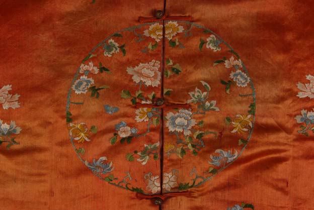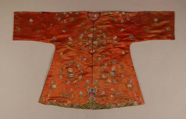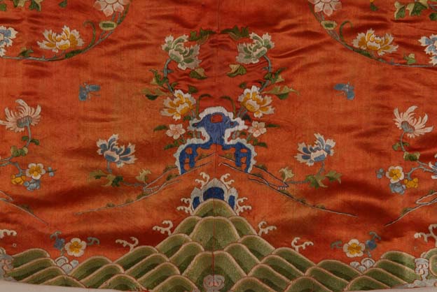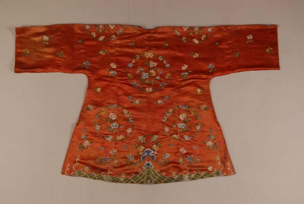 該女褂,圓領(lǐng)、對襟、寬袖、圓擺,釘一字盤扣五枚。前后衣襟及肩部繡有八枚平針繡大團花,其中飾以“蝶戀花”吉祥紋樣。團花外散綴著各式折枝花卉和蝴蝶、蝙蝠等紋樣。褂服下端繡江崖海水。袖子處有拼縫的跡象。