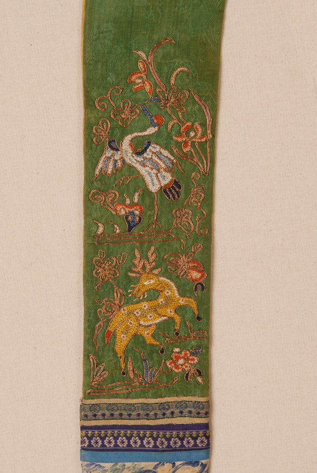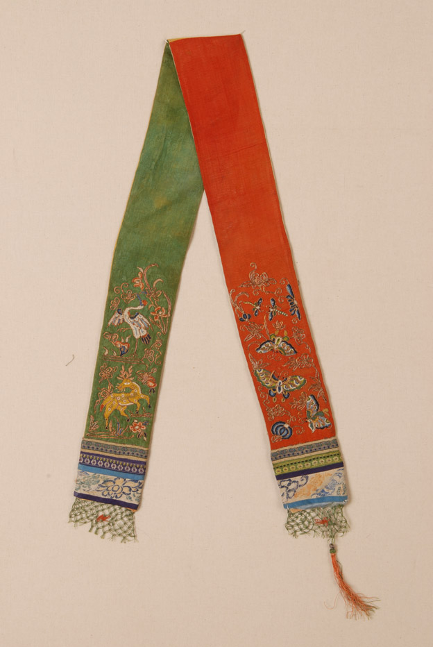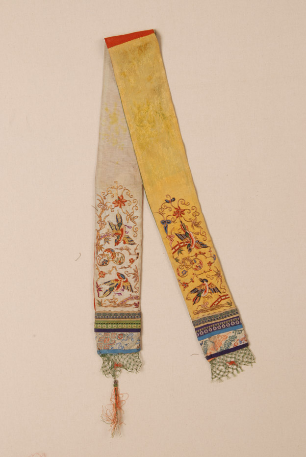 描述:該飾帶有四片不同的面料拼縫而成,分別為白色橫羅、紅色橫羅、綠色暗花綢及黃色暗花綢,前兩者組織相同,均為三梭橫羅;后兩者組織及圖案均相同,均為平紋地上起3/1右斜紋花。四片繡地上的圖案不盡相同,分別為花果雙鳥、蝴蝶瓜果、鹿鶴同春及花果雙鳥紋樣。在刺繡技法上則采用了打籽、盤金等繡法。飾帶兩端各鑲有幾層絳帶,縫有絲線結成的流蘇裝飾,其中一頭尚遺有穗子一。