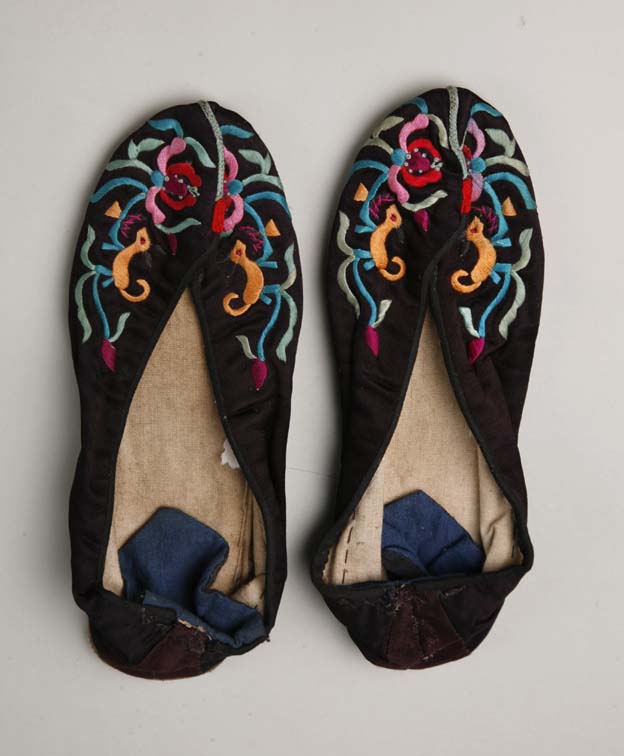 在鞋類大家庭中,鞋文化與刺繡藝術(shù)完美結(jié)合的中國(guó)繡花鞋是華夏民族獨(dú)創(chuàng)的手工藝品,這種根植于民族文化中的生活實(shí)用品被世人譽(yù)稱“中國(guó)鞋”。該繡花鞋采用黑色緞面為鞋面,其上彩繡花卉紋和動(dòng)物紋,所用針法以平繡為主,輔以打籽繡。繡鞋腳跟綴有一小塊布料。