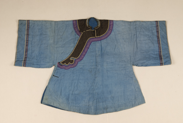 描述: 該襖,圓領(lǐng)、右衽。面料為藍(lán)色絹,領(lǐng)緣鑲有黑邊和紫色小絳帶。