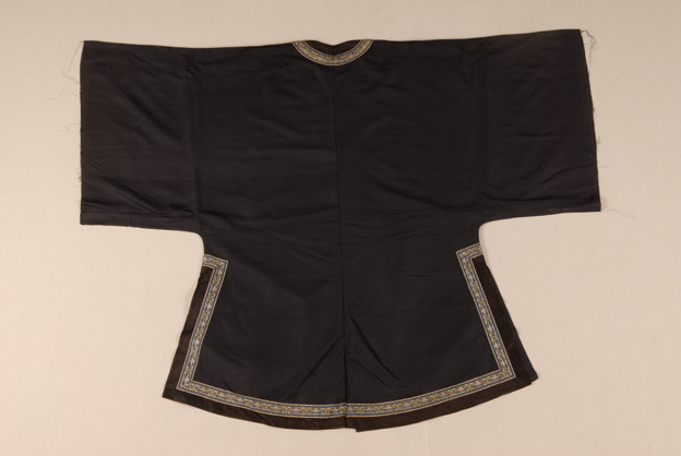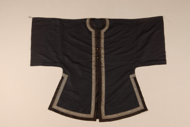 描述:該女褂,圓領(lǐng)、對襟、廣袖。采用面料為石青色絹。領(lǐng)緣、襟緣及下擺鑲有小絳帶。