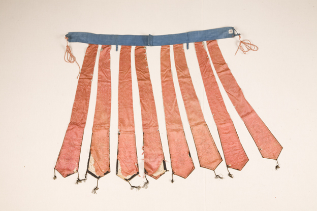 描述:該繡品為一裙帶,藍(lán)色布料下釘有八根暗花綢制成的繡花長帶,繡有福壽花卉紋樣,針法以平針為主。裙帶下端釘有云頭狀紋飾。