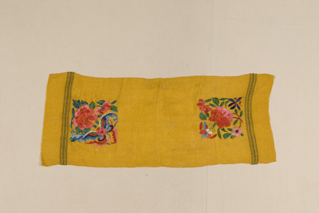描述:該件織物以暗花縐綢制成,基礎組織為平紋地上起3/1左斜紋花,圖案分為三個區(qū),兩端分別長6cm、6.5cm的小長方形花紋區(qū),中間為長61.5cm的花卉紋區(qū),三區(qū)之間均以寬2.5cm的條形紋樣區(qū)分隔。圍巾兩端各以戧針等技法繡出花卉蝴蝶紋樣。