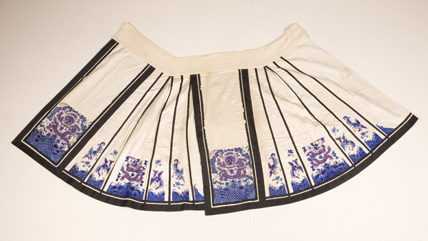描述:此裙裙身面料為白色素緞,其上繡出龍鳳紋樣,其中馬面部分為一坐龍,下擺處則龍鳳皆有之,顏色以藍(lán)色調(diào)為主。裙擺兩側(cè)壓以細(xì)黑素緞,以藍(lán)色素絹?zhàn)鲆r里。下擺、馬面兩側(cè)以黑色素緞鑲飾。