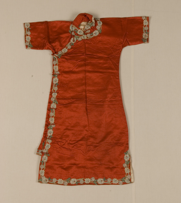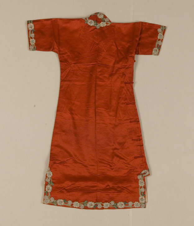 描述:該旗袍,中高立領(lǐng),短袖,窄袖口,右衽,一字扣。下擺左右兩邊開(kāi)衩。面料為大紅色緞,絹?zhàn)饕r。領(lǐng)緣、襟緣和下擺等處鑲有花邊。