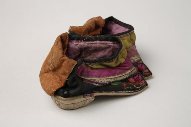石青緞金絲紅綠綢邊繡花卉小腳鞋