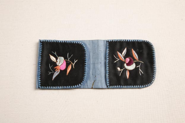 描述:該繡品為一褡褳,使用時(shí)掛在腰帶之上,兩端各成一個(gè)袋子。其上下袋子均以石青緞為地,彩繡花卉紋樣。繡法主要為平針。