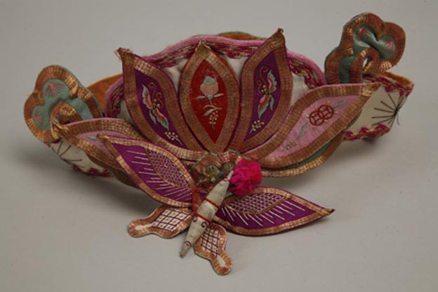 描述:該童冠飾用大紅、紫色等五彩緞貼繡成蓮花樣式。其上彩繡花蝶紋樣。因使用貼繡的方法,因而具有較強(qiáng)的立體感。