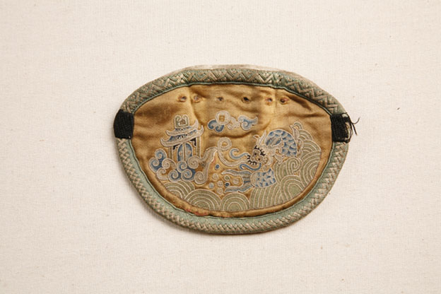 描述:該繡品為一橢圓形荷包。中央?yún)^(qū)域黃色緞地上打籽繡海水云龍紋樣。周?chē)冒拙G相間的絳帶緣邊。