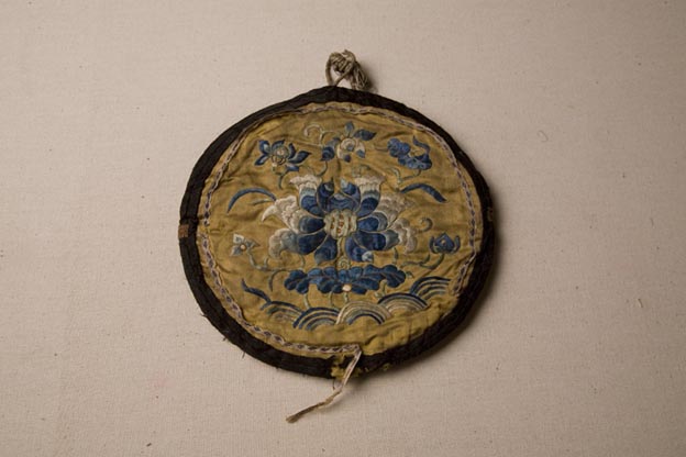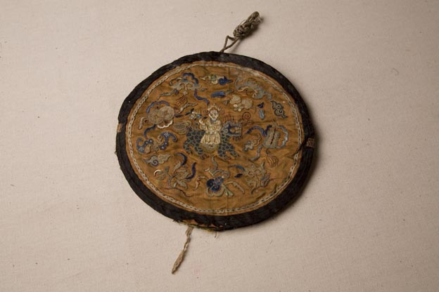 該繡品為一鏡套,圓形,夾棉。主體面料為緞織物,其上打籽繡暗八仙麟麟送子紋樣。表達人們希冀子孫繁衍、綿延不絕的美好祈愿。