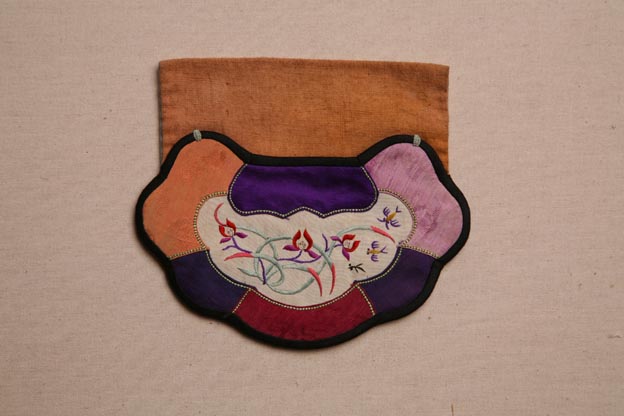 該繡品為一錢袋,呈兒童長壽鎖形。主體面料采用多色彩綢。其中央一塊白色綢上彩繡金魚花草紋樣,所用針法以套針為主。彩綢周圍鑲黑色素緞為邊。