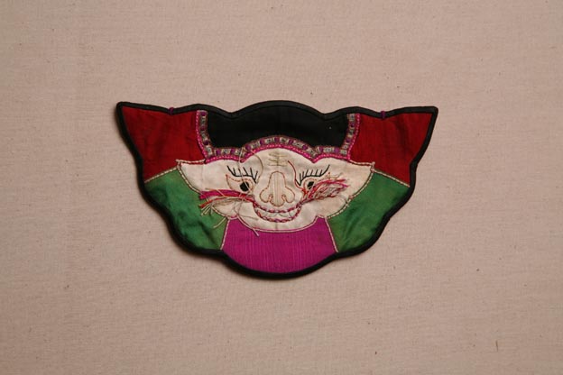 描述:該繡品為一錢袋,呈虎頭形。主體面料采用五彩綢緞。其中央一塊白色緞地上圈金繡一虎頭。彩綢周圍鑲黑色素緞為邊。