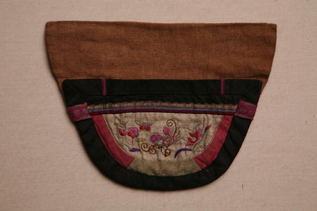 描述:該繡品為一錢袋,呈碗形。中央白色素緞上彩繡花草紋樣。所用針?lè)ㄒ蕴揍槥橹鳎o以釘金繡等。