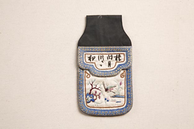 該繡品為一錢袋,袋身呈方形。主體面料采用白色素緞,其上彩繡花草蟲紋樣。所用針法以套針為主,輔以直針、打籽等。錢袋蓋用黑色絲線繡詩文一句。