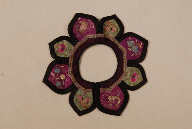 玫紅秋香色緞圈金繡花卉蟲蝶口圍