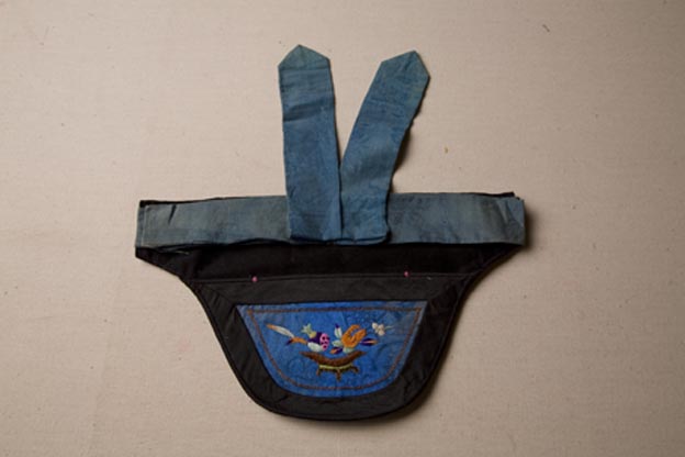 該繡品為一腰包。中央面料為藍(lán)綢一塊。其上用彩繡石榴佛手紋樣,針?lè)ㄒ云嚼C為主,輔以釘金繡等。藍(lán)綢外包黑色素緞。腰帶部分則用藍(lán)色暗花緞裁剪而成。