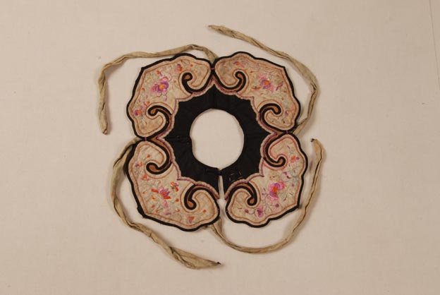 該口圍呈四瓣花形,在白色緞地上以彩色絲線刺繡蜂花紋樣,所用針法以套針為主。周圍用黑色素緞鑲邊。口圍片周圍等距離地鑲有四根淺綠色絲帶。