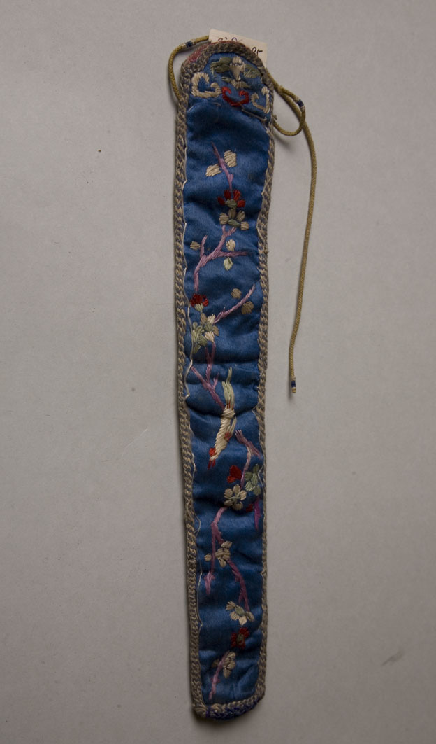 該繡品為一扇套。主體面料為藍白色素緞。其上除彩繡折枝花鳥紋樣外,主要用黑色絲線繡了“南枝向暖北枝寒,一種春風有兩般”詩句一段。扇套周圍鑲褐色小絳帶花邊。