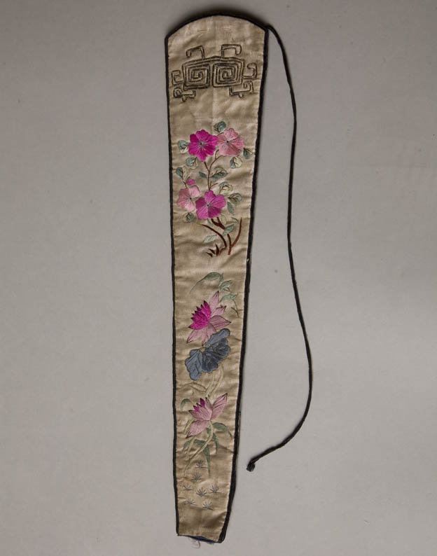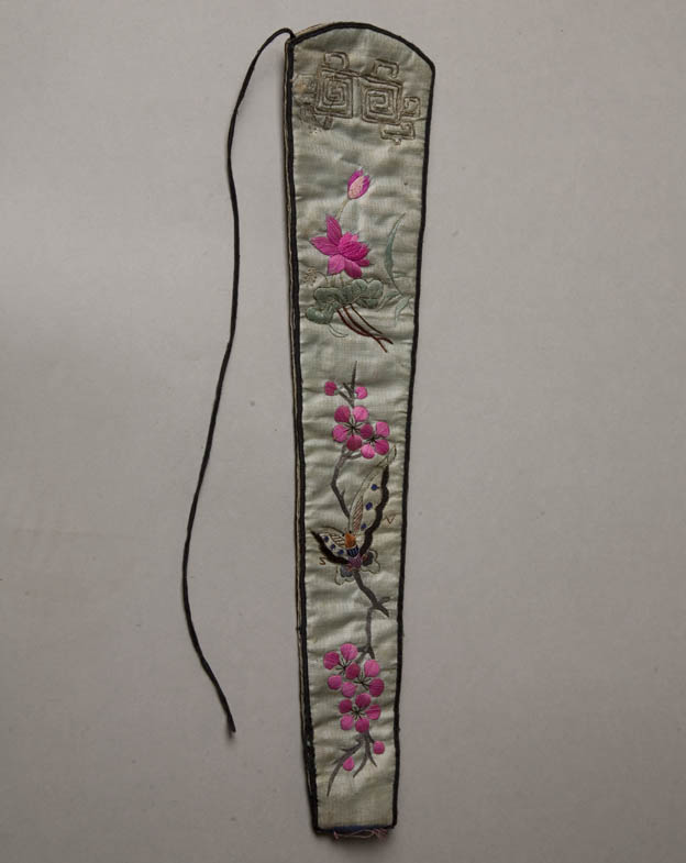 描述:該繡品為一扇套。主體面料為月白色素緞。其上彩繡荷花飛蝶紋樣。所用針法以平繡為主,輔以釘金繡等。扇套周圍鑲深色花邊。