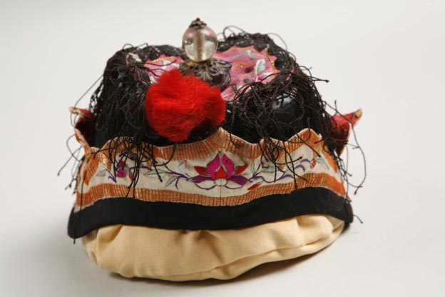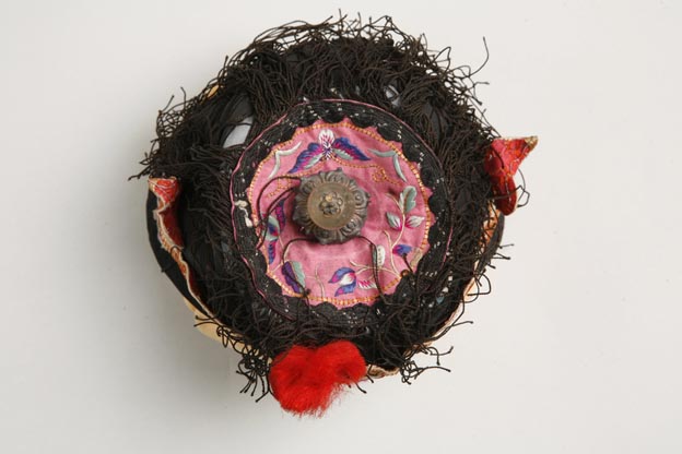 該童帽采用石青緞為主體面料,紅、白色緞上彩繡花蝶紋樣。針法包括套針、直針等。用色艷麗,具有強烈的民間風(fēng)味。帽身周圍綴有黑色絲線流蘇,帽頂綴一小巧的凸起金屬物,具有較強的立體感。