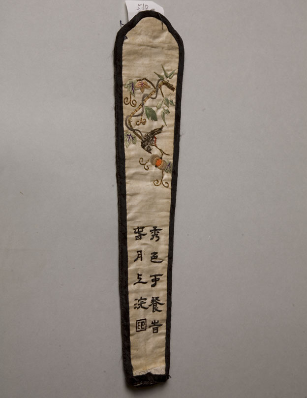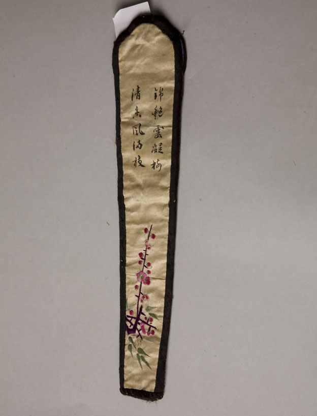 描述:該繡品為一扇套。主體面料為白色素緞。其上除彩繡折枝梅竹紋樣外,另用黑色絲線繡“錦艷云凝梅,清香風(fēng)滿枝”詩(shī)句。所用針法以套針為主。扇套周圍鑲黑色素緞為邊。