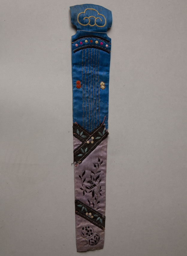 描述:該繡品為一扇套片。主體面料為藍藕色緞。其上彩繡花草。所用針法以套針為主,結(jié)合釘金繡、貼繡等。