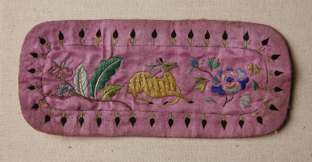 描述:此眼鏡盒面色彩艷麗,上繡黃色奔鹿及花卉,并以小花苞圍邊,顯得別致可愛。