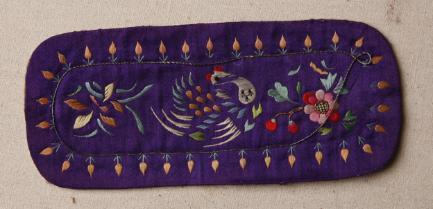 描述:該繡品為一眼鏡盒面,長方形。主體面料為醬紫色緞,其上彩繡花鳥紋樣。主要針法為套針。