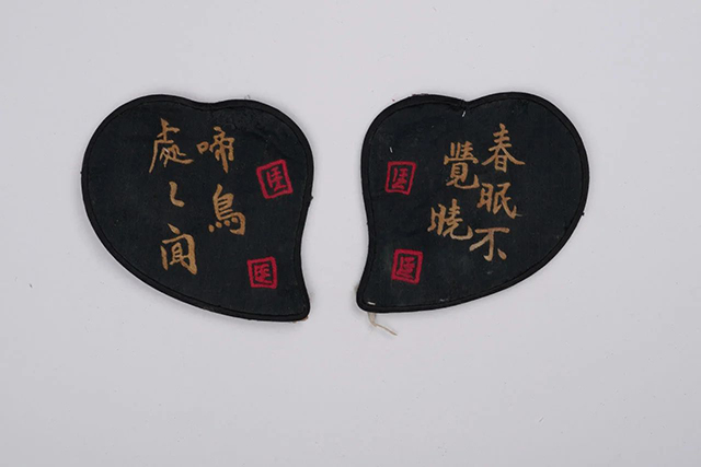 在黑緞地上以黃色絲線刺繡“春眠不覺曉,處處聞啼鳥”。