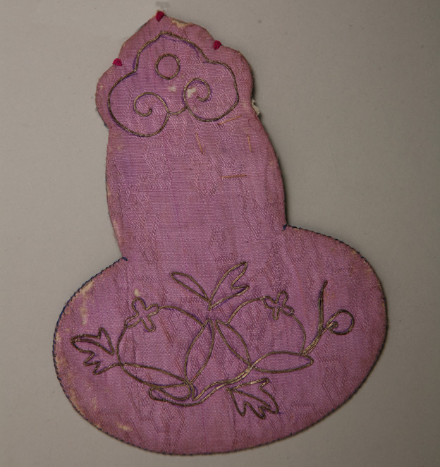 描述:該繡品為一煙絲袋,葫蘆形。主體面料為藍(lán)藕色綢,其上圈金繡柿子紋樣。周圍鑲黑色小絳帶花邊,部分脫落。