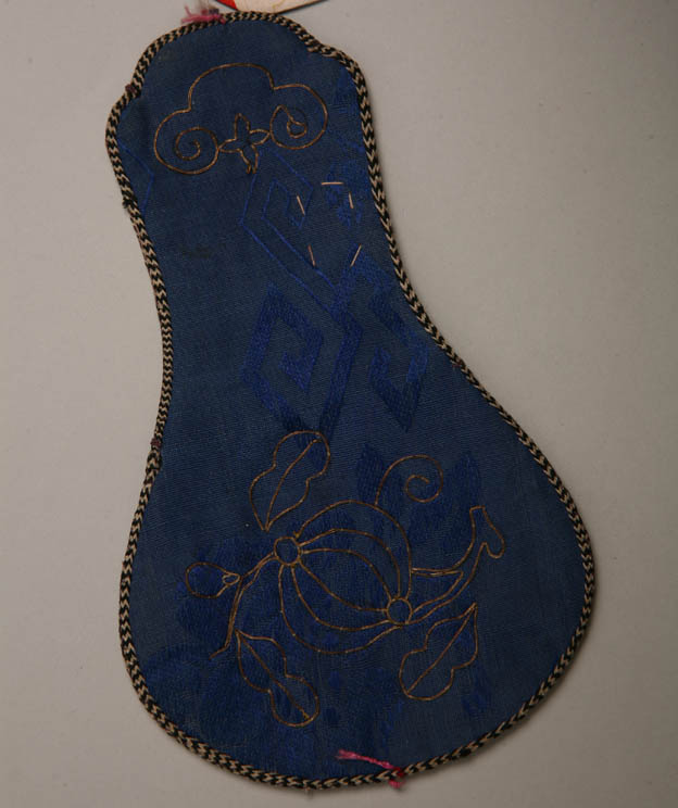 描述:該繡品為一煙絲袋,瓶形。主體面料為藍(lán)藕色綢,其上圈金繡瓜果紋樣。周?chē)偹{(lán)黑相間的小絳帶花邊。